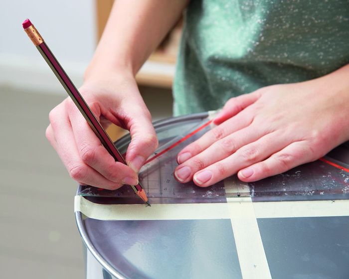 Приклейте малярную ленту в форме креста ко дну каждого ведра. Используйте заданный квадрат так, чтобы сегменты малярной ленты пересеклись крест-накрест в центре днища. Затем отметьте карандашом на поверхности дна по 4 точки, в которых вы будете сверлить отверстия. Разместите эти места в середине каждого из четырех линий креста (как на фото).