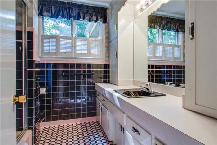 Гостевая ванная комната ранее была отделана устаревшей плиткой и сантехникой. Чтобы сделать ее просторнее и интереснее, ее оформили с помощью элегантных обоев с летящими птицами, заменили сантехнику и мебель, сохранив прежнюю планировку и расположение окна.