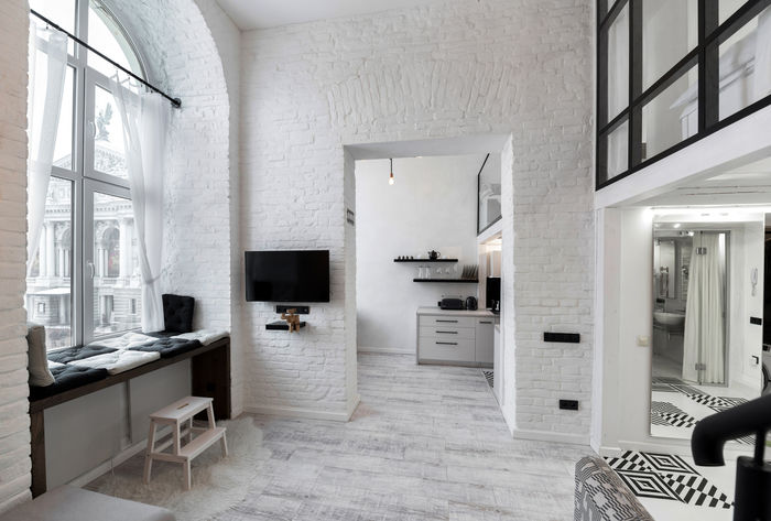 Гостиная, хотя и небольшая, кажется больше из-за потолка с двойной высотой и окрашенных в белый цвет кирпичных стен. Окошко рядом с диваном было встроено в подоконник, создавая дополнительные сидения.