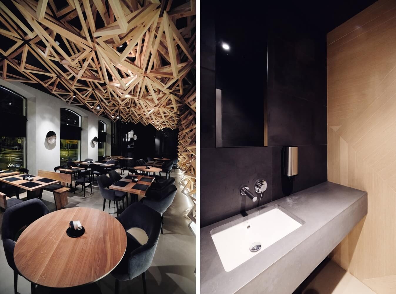 Полученная впечатляющая структура напоминает частично оригами либо геометрические орнаменты из Японии. Чтобы ее выделить, интерьер сделали в приглушенных тонах, используя серый цвет в оформлении стен и полов. Также использование черных элементов в мебели добавило элегантности в сервировке.