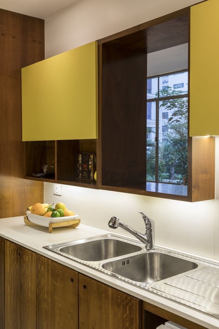 Ранее планировка была очень фрагментированной, поэтому архитекторы решили снести несколько стен, чтобы создать более открытое и гибкое пространство, воздушное и светлое. Но вопрос зонирования оставался открытым – чтобы разделить зоны между собой, были использованы темные деревянные шкафы-гардеробные, размещенные в стратегических местах. Они выполнены из дерева imbuia, которое произрастает только в Бразилии. Шкафы двусторонние, то есть могут быть использованы со стороны любого помещения. Например, шкаф между спальней и офисом служит как для хранения вещей, так и для канцелярии и документов.