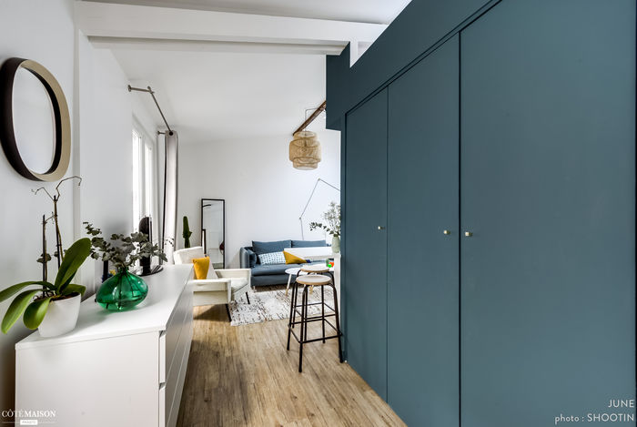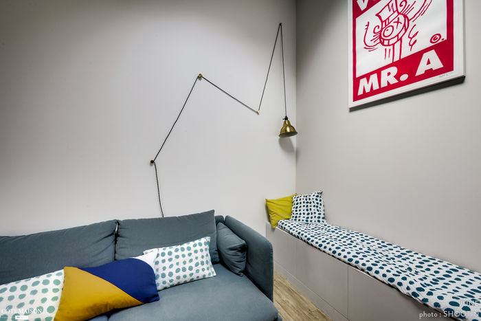 Небольшая студия была разделена на три основных отдела: зону кухни, гостиную и спальню. При этом разделение происходило не только по горизонтали, но и по вертикали: спальню подняли на второй ярус, обустроенный на ярко-синей конструкции. Этот блок служит многофункциональным «органайзером» пространства, так как позволяет решить множество проблем, свойственных маленьким квартирам: в первую очередь помогает справиться с недостатком для хранения и грамотно зонировать жилье. Часто мансарды и чердаки используют недостаточно эффективно, отдавая им роль мест для хранения. Но в миниатюрных квартирах мансарды – это роскошь: любая дополнительная площадь – настоящее спасение в обстановке жилья.
