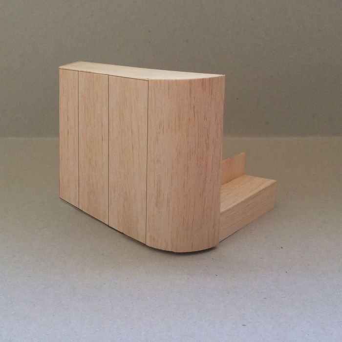 На другой стороне мебельного блока находится кровать, стеллаж и встроенная мягкая скамья, которые создают более защищенное место для сна и отдыха в полуоткрытом пространстве. Аналогичный подход используется с изогнутым столом на кухне, который служит подготовительным и неформальным обеденным пространством.