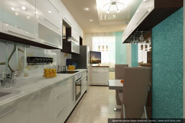 В узкой кухне светильники должны быть размещены под высокой мебелью для рабочей поверхности и потолком, чтобы достаточно осветить всю комнату. С несколькими источниками света, адаптированными к областям деятельности, кухня хорошо освещена. Чтобы привнести больше света, стоит выбрать мебель с витринами, чтобы обеспечить большую прозрачность. Также подсветка под мебелью обеспечивает оптимальное освещение.